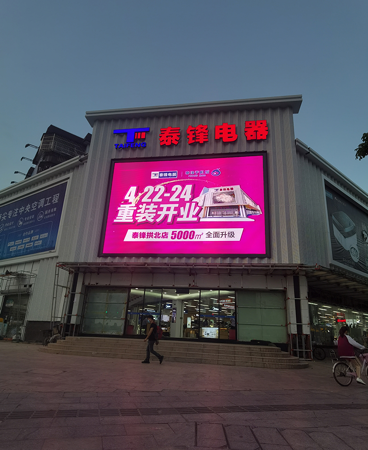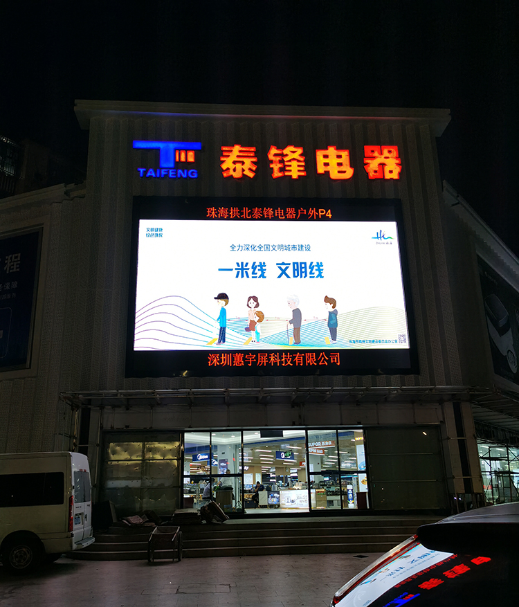 珠海拱北泰鋒電器p4戶外廣告屏完成,高清高亮,節能穩定防水,蕙宇屏關注LED顯示屏十幾年,可提供一站式方案。